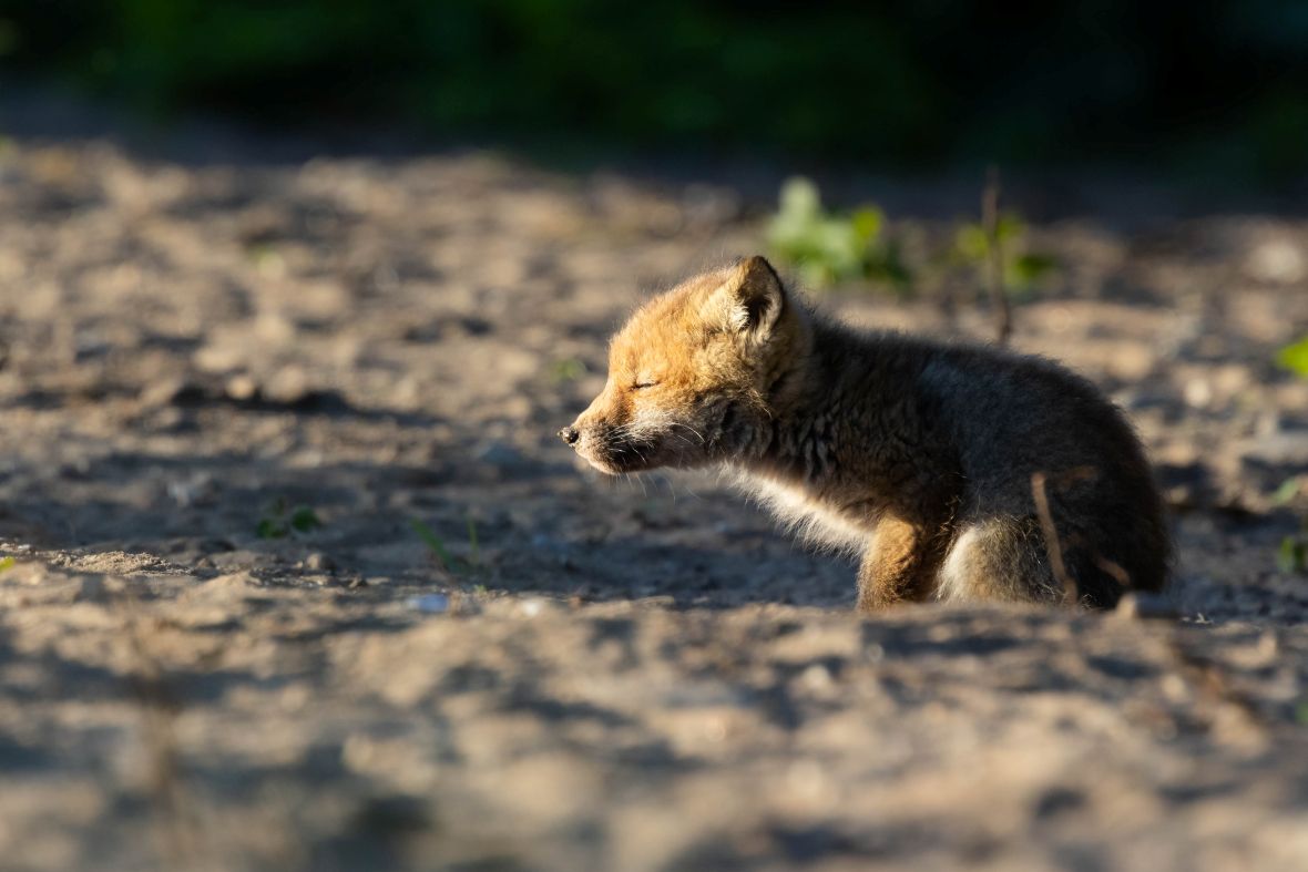 Rävvalp njuter av morgonsolen (Sverige)